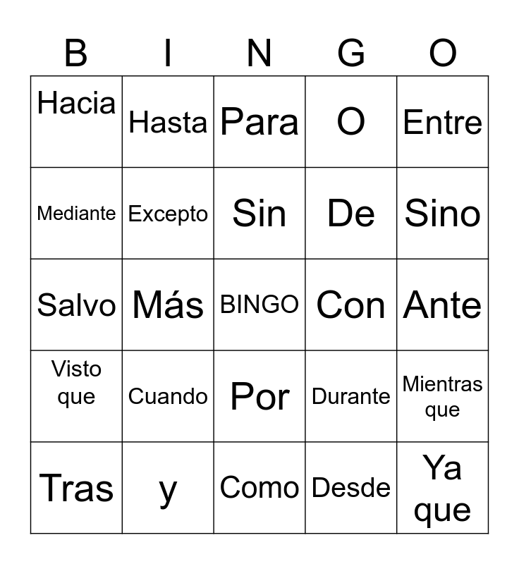 This bingo card has a free space and 24 words: Cuando, y, Sin, Tras, Entre, Hacia, Mediante, Hasta, Con, Por, De, Salvo, Durante, Mientras que, Excepto, Desde, Ante, Para, Sino, Más, Ya que, Visto que, O and Como.