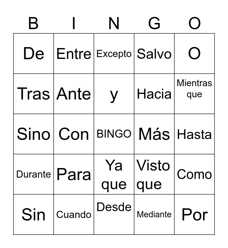 This bingo card has a free space and 24 words: Para, Cuando, y, Sin, O, De, Tras, Entre, Más, Ya que, Hacia, Sino, Visto que, Como, Ante, Mediante, Hasta, Excepto, Mientras que, Con, Por, Durante, Salvo and Desde.