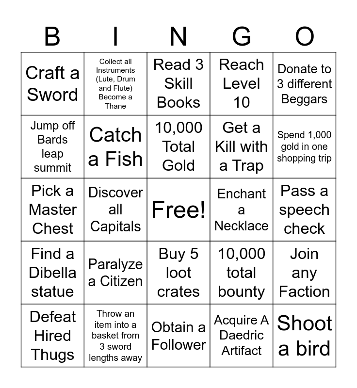 This bingo card has a free space and 55 words: Buy a Horse, Defeat Hired Thugs, Complete a Quest, Craft a Sword, Obtain a Follower, Collect 5 Nirnroot, Catch a Fish, Buy a House, Get a Kill with a Trap, Join the Civil War, Reach Level 10, Mine Ebony, 2 Stones of Barenziah, Get Married, Acquire a Daedra heart, Punch a Jarl, Donate to 3 different Beggars, Discover all Capitals, Kill a Frost Troll, Shoot a bird, Enchant a Necklace, Find and Activate a Standing Stone, 10,000 total bounty, Read 3 Skill Books, Craft Armor, 10,000 Total Gold, Acquire A Daedric Artifact, Hand to Hand Surplex, Pass a speech check, Join any Faction, Become a Werewolf or a Vampire, Get a Bottle Skooma, Free a Prisoner of War, Drink with the revelers, Jump off Bards leap summit, Pick a Master Chest, Fill any soul gem, Find a Dibella statue, Play with Kayd, Shoot yourself with an Arrow, Collect all Instruments (Lute, Drum and Flute) Become a Thane, Adopt a Pet, Learn Bound Bow, Get a skill to 50+, Paralyze a Citizen, Throw an item into a basket from 3 sword lengths away, Pickpocket an Enchanted Ring, Throw a Body off a Cliff, Kill a Riekling, Spend 1,000 gold in one shopping trip, Sit in a Jarls Throne, Escape from Jail, Get a letter from a courier., Buy 5 loot crates and Replace 3 Shopkeepers.