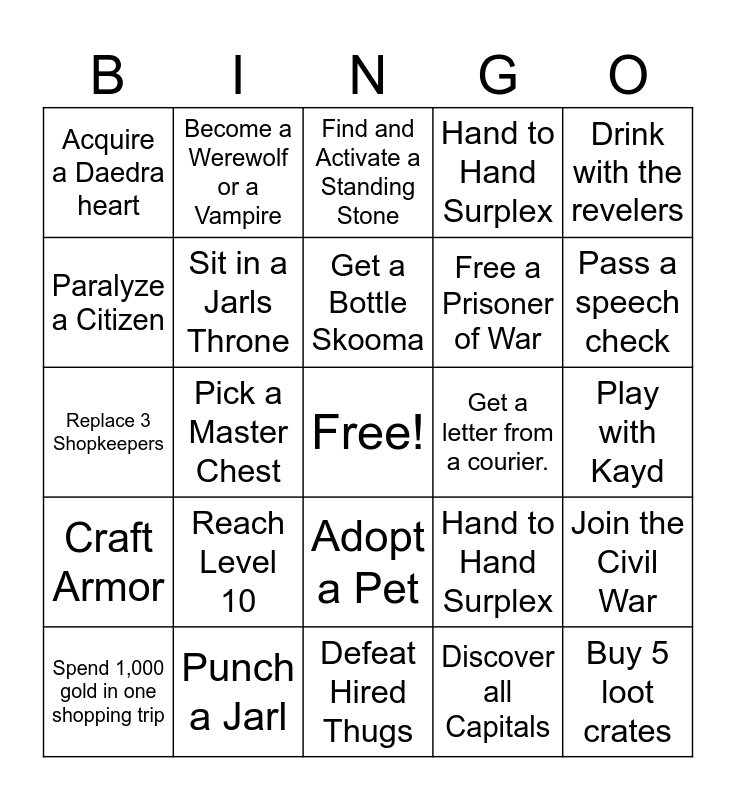 This bingo card has a free space and 111 words: Buy a Horse, Defeat Hired Thugs, Complete a Quest, Craft a Sword, Obtain a Follower, Collect 5 Nirnroot, Catch a Fish, Buy a House, Get a Kill with a Trap, Join the Civil War, Reach Level 10, Mine Ebony, 2 Stones of Barenziah, Get Married, Acquire a Daedra heart, Punch a Jarl, Donate to 3 different Beggars, Discover all Capitals, Kill a Frost Troll, Shoot a bird, Enchant a Necklace, Find and Activate a Standing Stone, 10,000 total bounty, Read 3 Skill Books, Craft Armor, 10,000 Total Gold, Acquire A Daedric Artifact, Hand to Hand Surplex, Pass a speech check, Join any Faction, Become a Werewolf or a Vampire, Get a Bottle Skooma, Free a Prisoner of War, Drink with the revelers, Jump off Bards leap summit, Pick a Master Chest, Fill any soul gem, Find a Dibella statue, Play with Kayd, Shoot yourself with an Arrow, Collect all Instruments (Lute, Drum and Flute) Become a Thane, Adopt a Pet, Learn Bound Bow, Get a skill to 50+, Paralyze a Citizen, Throw an item into a basket from 3 sword lengths away, Pickpocket an Enchanted Ring, Throw a Body off a Cliff, Kill a Riekling, Spend 1,000 gold in one shopping trip, Sit in a Jarls Throne, Escape from Jail, Get a letter from a courier., Buy 5 loot crates, Replace 3 Shopkeepers, Buy a Horse, Defeat Hired Thugs, Complete a Quest, Craft a Sword, Obtain a Follower, Collect 5 Nirnroot, Catch a Fish, Buy a House, Get a Kill with a Trap, Join the Civil War, Reach Level 10, Mine Ebony, 2 Stones of Barenziah, Get Married, Acquire a Daedra heart, Punch a Jarl, Donate to 3 different Beggars, Discover all Capitals, Kill a Frost Troll, Shoot a bird, Enchant a Necklace, Find and Activate a Standing Stone, 10,000 total bounty, Read 3 Skill Books, Craft Armor, 10,000 Total Gold, Acquire A Daedric Artifact, Hand to Hand Surplex, Pass a speech check, Join any Faction, Become a Werewolf or a Vampire, Get a Bottle Skooma, Free a Prisoner of War, Drink with the revelers, Jump off Bards leap summit, Pick a Master Chest, Fill any soul gem, Find a Dibella statue, Play with Kayd, Shoot yourself with an Arrow, Collect all Instruments (Lute, Drum and Flute) Become a Thane, Adopt a Pet, Learn Bound Bow, Get a skill to 50+, Paralyze a Citizen, Throw an item into a basket from 3 sword lengths away, Pickpocket an Enchanted Ring, Throw a Body off a Cliff, Kill a Riekling, Spend 1,000 gold in one shopping trip, Sit in a Jarls Throne, Escape from Jail, Get a letter from a courier., Buy 5 loot crates, Replace 3 Shopkeepers and Get Mead with Juniper Berry.