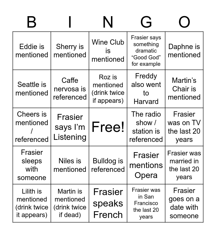 This bingo card has a free space and 24 words: Niles is mentioned, Martin is mentioned (drink twice if dead), Roz is mentioned (drink twice if appears), Lilith is mentioned (drink twice it appears), Daphne is mentioned, Eddie is mentioned, Seattle is mentioned, Sherry is mentioned, The radio show / station is referenced, Bulldog is referenced, Freddy also went to Harvard, Cheers is mentioned / referenced, Frasier mentions Opera, Frasier was married in the last 20 years, Caffe nervosa is referenced, Frasier was in San Francisco the last 20 years, Frasier was on TV the last 20 years, Wine Club is mentioned, Martin’s Chair is mentioned, Frasier says I’m Listening, Frasier goes on a date with someone, Frasier sleeps with someone, Frasier says something dramatic “Good God” for example and Frasier speaks French.