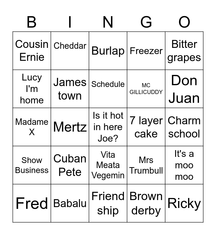 This bingo card has a free space and 43 words: Tilly, Ricky, Lucy, Fred, Stymie, Brown derby, Burlap, Loving cup, Bitter grapes, Babalu, Freezer, 7 layer cake, Vita Meata Vegemin, Cuban Pete, Mink stole, Friend ship, Ethel, Madame X, The time has come, Don Juan, Cheddar, Egg tango, East 68th Street, Cousin Ernie, Passport, Charm school, BBQ, Apt 3D, Mrs Trumbull, Show Business, Havana, It's a moo moo, Queen of the gypsies, Mertz, Tropicana, Ricardo, Wicked city woman, Schedule, Lucy I'm home, MC GILLICUDDY, Gitche Gumee, James town and The masher.