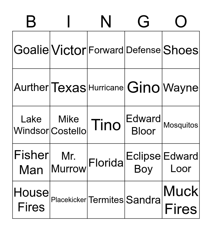 This bingo card has 30 words: Placekicker, Joey, Mike Costello, Luis, Goalie, Forward, Texas, Florida, Edward Bloor, Termites, Mosquitos, Tino, Sandra, Muck Fires, Wayne, Gym, Eclipse Boy, Fisher Man, Mr. Murrow, Shoes, Lake Windsor, Sinkhole, Victor, Gino, Aurther, Defense, Edward Loor, House Fires, Hurricane and Erick.