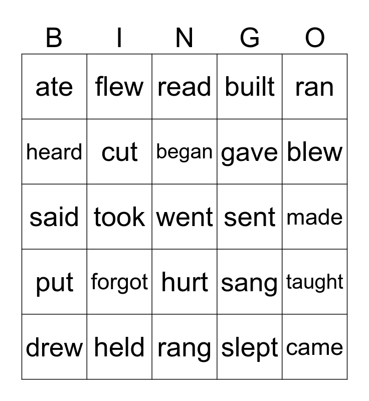 This bingo card has a free space and 24 words: forgot, held, began, drew, ran, ate, heard, flew, sent, hurt, gave, said, sang, taught, cut, slept, made, read, blew, took, came, put, built and rang.