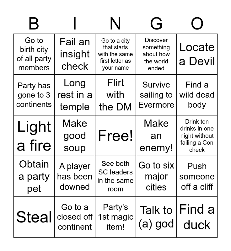 This bingo card has a free space and 49 words: Go to all SC cities, Find a duck, Meet at least 10 races, Party's 1st magic item!, A player has been downed, Party member gets a tattoo, Fail an insight check, Make a friend!, Party has gone to 3 continents, Party's first heist, Long rest in a temple, Discover something about how the world ended, Push someone off a cliff, Go to six major cities, Sneak and succeed, Long rest in the mountains, Flirt with the DM, Make an enemy!, Meet all SC Division leaders, Locate a Devil, Make good soup, Talk to (a) god, Go to birth city of all party members, Survive sailing to Evermore, Live to tell the tale of the Isle of Monsters, Find a wild dead body, Steal, Take first watch at night, See both SC leaders in the same room, Obtain a party pet, Find three god/ goddess temples, DM flirts back, Win a carnival game, Defeat an owlbear in Porthaewry, Go to a closed off continent, Start a war, Handle a café for a day, Defeat a gambler, Drink ten drinks in one night without failing a Con check, Win a trivia competition, Sail a boat, Find a magical deck of cards, Eat some beans, Get closer with a party member, Light a fire, Go to a city that starts with the same first letter as your name, Win a duel, Get promoted and Break a bone.