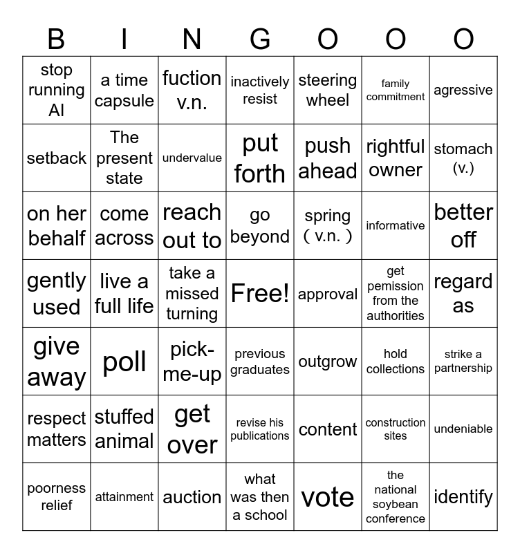 This bingo card has a free space and 48 words: content, rightful owner, what was then a school, live a full life, reach out to, regard as, a time capsule, attainment, family commitment, previous graduates, agressive, inactively resist, informative, spring(v.n.), respect matters, get pemission from the authorities, setback, stomach (v.), construction sites, steering wheel, push ahead, take a missed turning, stop running AI, The present state, undeniable, undervalue, better off, poorness relief, go beyond, come across, the national soybean conference, approval, strike a partnership, stuffed animal, gently used, outgrow, hold collections, on her behalf, pick-me-up, get over, give away, identify, fuction v.n., auction, put forth, revise his publications, poll and vote.