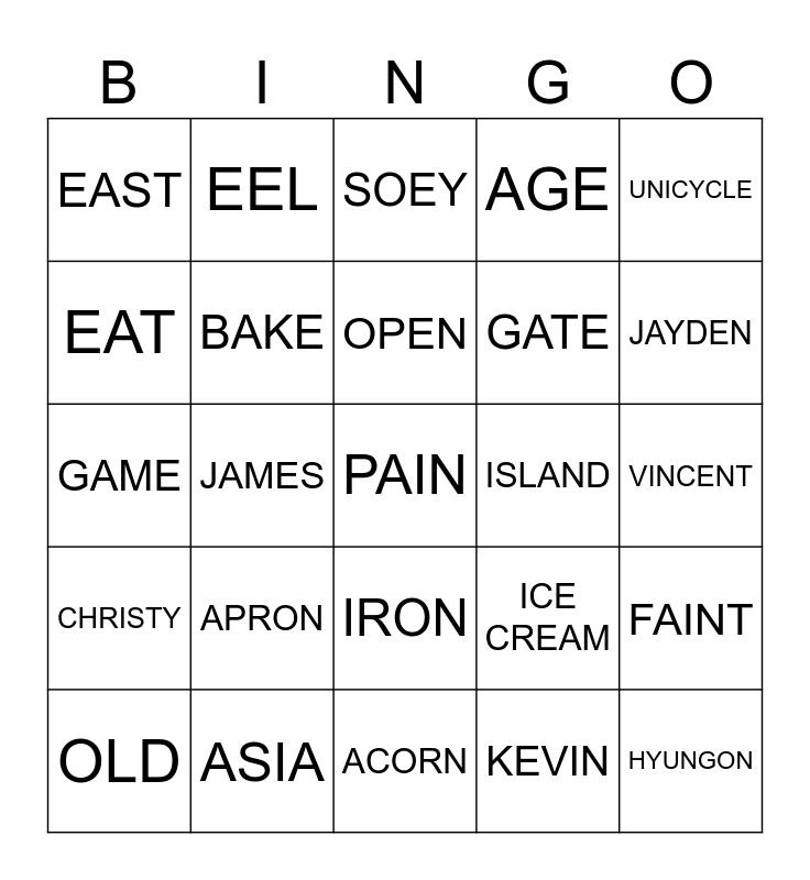 This bingo card has a free space and 24 words: APRON, ASIA, OPEN, OLD, UNICYCLE, EAST, EAT, EEL, ISLAND, IRON, GATE, GAME, ICE CREAM, FAINT, BAKE, KEVIN, VINCENT, SOEY, JAYDEN, JAMES, HYUNGON, CHRISTY, AGE and ACORN.