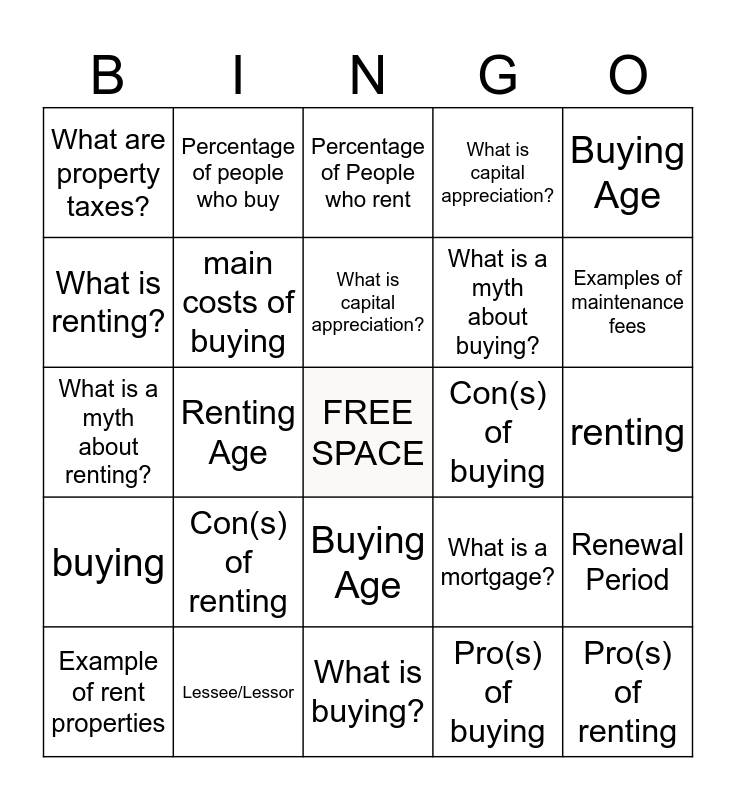 This bingo card has a free space and 24 words: Con(s) of renting, Lessee/Lessor, What is capital appreciation?, Example of rent properties, Buying Age, What are property taxes?, What is renting?, Percentage of people who buy, Con(s) of buying, Buying Age, What is a myth about buying?, What is a myth about renting?, What is a mortgage?, Renewal Period, main costs of buying, Pro(s) of buying, renting, Percentage of People who rent, Examples of maintenance fees, Renting Age, Pro(s) of renting, buying, What is capital appreciation? and What is buying?.