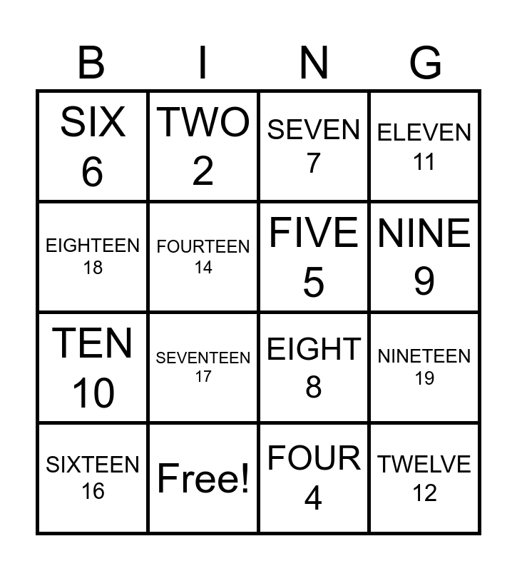 This bingo card has 21 words: Free!, ONE 1, TWO 2, THREE 3, FOUR 4, FIVE 5, SIX 6, SEVEN 7, EIGHT 8, NINE 9, TEN 10, ELEVEN 11, TWELVE 12, THIRTEEN 13, FOURTEEN 14, FIFTEEN 15, SIXTEEN 16, SEVENTEEN 17, EIGHTEEN 18, NINETEEN 19 and TWENTY 20.
