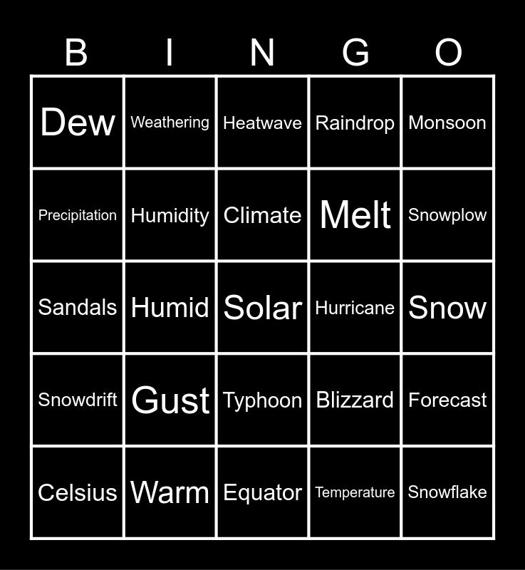 This bingo card has 100 words: Sun, Rain, Snow, Wind, Clouds, Thunder, Lightning, Fog, Hail, Rainbow, Storm, Cold, Hot, Warm, Cool, Freeze, Melt, Ice, Breeze, Drizzle, Shower, Drought, Mist, Sleet, Tornado, Hurricane, Monsoon, Blizzard, Overcast, Haze, Humid, Dew, Sizzle, Puddle, Temperature, Climate, Forecast, Meteorology, Climate, Snowflake, Raincoat, Boots, Sandals, Snowball, Snowplow, Heatwave, Cyclone, Sunrise, Sunset, Equator, Solstice, Daylight, Twilight, Frostbite, Tropics, Thermometer, Celsius, Fahrenheit, Barometer, Raindrop, Snowstorm, Weatherman, Barbecue, Weathered, Cumulus, Cirrus, Nimbus, Evaporate, Flash flood, Hibernation, Frosty, Gust, Haze, Low-pressure, Meteor, Orbit, Parched, Precipitation, Radiant, Refraction, Saturation, Solar, Temperature, Typhoon, Water cycle, Weathering, Windchill, Frosty, Monsoon, Snowdrift, Sleet, Gusty, Fahrenheit, Celsius, Humidity, Damp, Stormy, Sunny, Partially cloudy and Snowy.