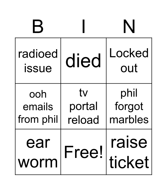 This bingo card has 15 words: Power off, call for phil when off, Locked out, radioed issue, Free!, tv portal reload, Phil not listening, wrong port, phil forgot marbles, raise ticket, penny, ooh emails from phil, ear worm, died and Last minute AV.