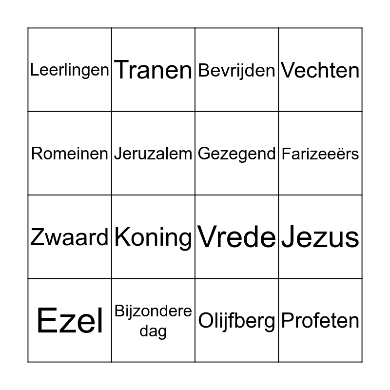 This bingo card has 16 words: Bijzondere dag, Jezus, Bevrijden, Leerlingen, Zwaard, Tranen, Vrede, Olijfberg, Romeinen, Jeruzalem, Ezel, Vechten, Koning, Farizeeërs, Gezegend and Profeten.