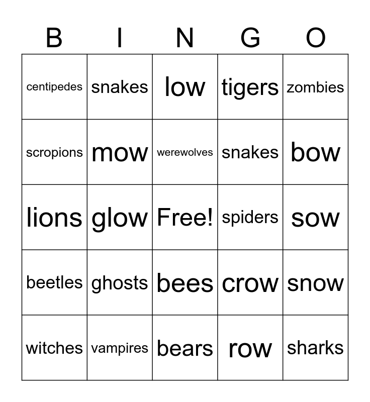 This bingo card has a free space and 24 words: ghosts, vampires, werewolves, witches, zombies, centipedes, scropions, snakes, spiders, bees, snakes, lions, crow, snow, mow, row, sow, low, bow, glow, sharks, beetles, tigers and bears.