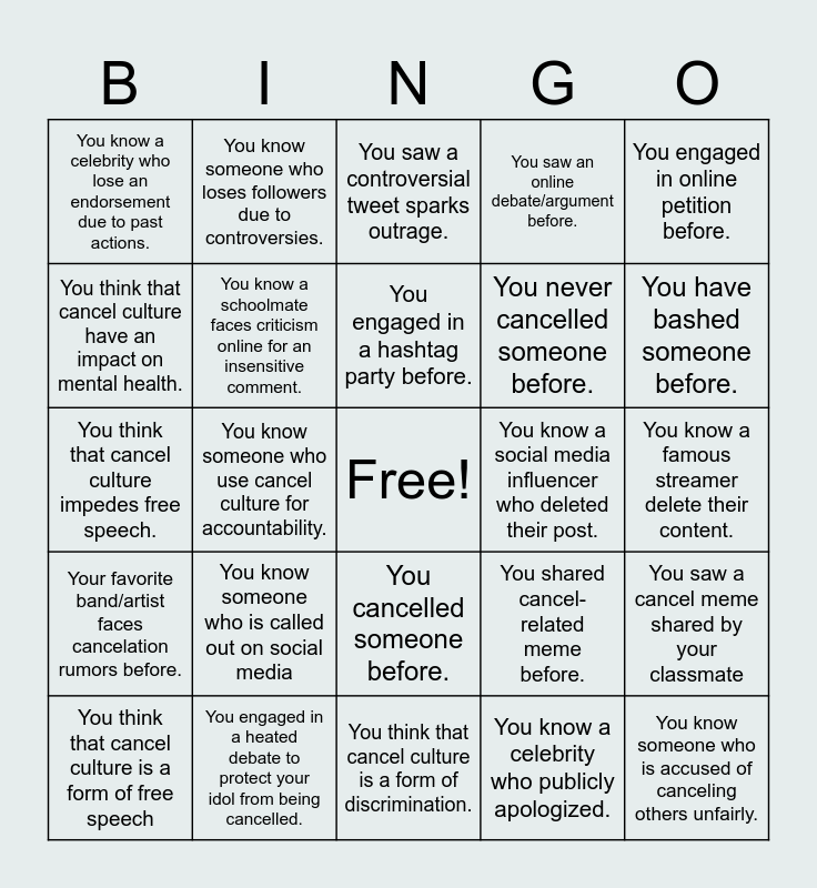 This bingo card has a free space and 24 words: You know someone who is called out on social media, You engaged in a heated debate to protect your idol from being cancelled., You engaged in a hashtag party before., You think that cancel culture is a form of free speech, You engaged in online petition before., You know a celebrity who lose an endorsement due to past actions., You think that cancel culture have an impact on mental health., You know someone who loses followers due to controversies., You know a social media influencer who deleted their post., You cancelled someone before., You never cancelled someone before., You think that cancel culture impedes free speech., You shared cancel-related meme before., You saw a cancel meme shared by your classmate, You know a schoolmate faces criticism online for an insensitive comment., You know a celebrity who publicly apologized., You know a famous streamer delete their content., You saw a controversial tweet sparks outrage., You have bashed someone before., You know someone who use cancel culture for accountability., You know someone who is accused of canceling others unfairly., Your favorite band/artist faces cancelation rumors before., You saw an online debate/argument before. and You think that cancel culture is a form of discrimination..