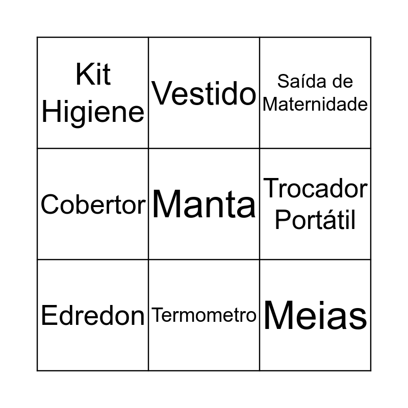 This bingo card has a free space and 8 words: Trocador Portátil, Saída de Maternidade, Vestido, Edredon, Kit Higiene, Meias, Cobertor and Termometro.