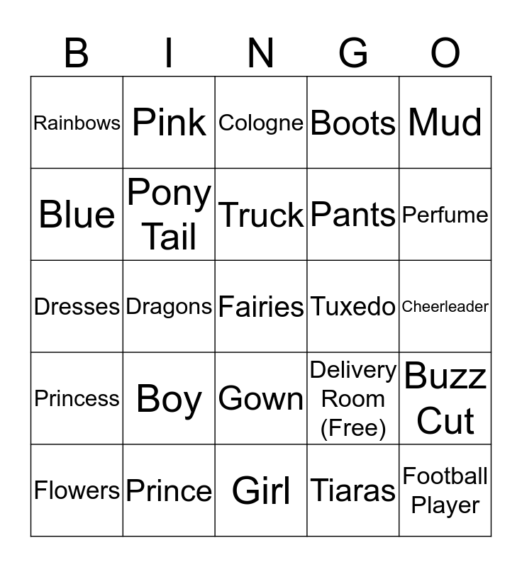 This bingo card has 25 words: Boy, Girl, Truck, Flowers, Mud, Rainbows, Blue, Pink, Tuxedo, Gown, Pants, Dresses, Delivery Room (Free), Buzz Cut, Pony Tail, Football Player, Cheerleader, Cologne, Perfume, Dragons, Fairies, Prince, Princess, Boots and Tiaras.