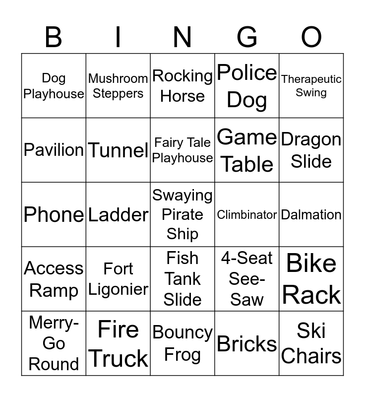 This bingo card has a free space and 24 words: Fort Ligonier, Fire Truck, Fairy Tale Playhouse, Merry-Go Round, Therapeutic Swing, Dog Playhouse, Pavilion, Mushroom Steppers, Climbinator, Fish Tank Slide, Game Table, Phone, 4-Seat See-Saw, Bike Rack, Tunnel, Bricks, Dalmation, Rocking Horse, Dragon Slide, Ladder, Ski Chairs, Access Ramp, Police Dog and Bouncy Frog.