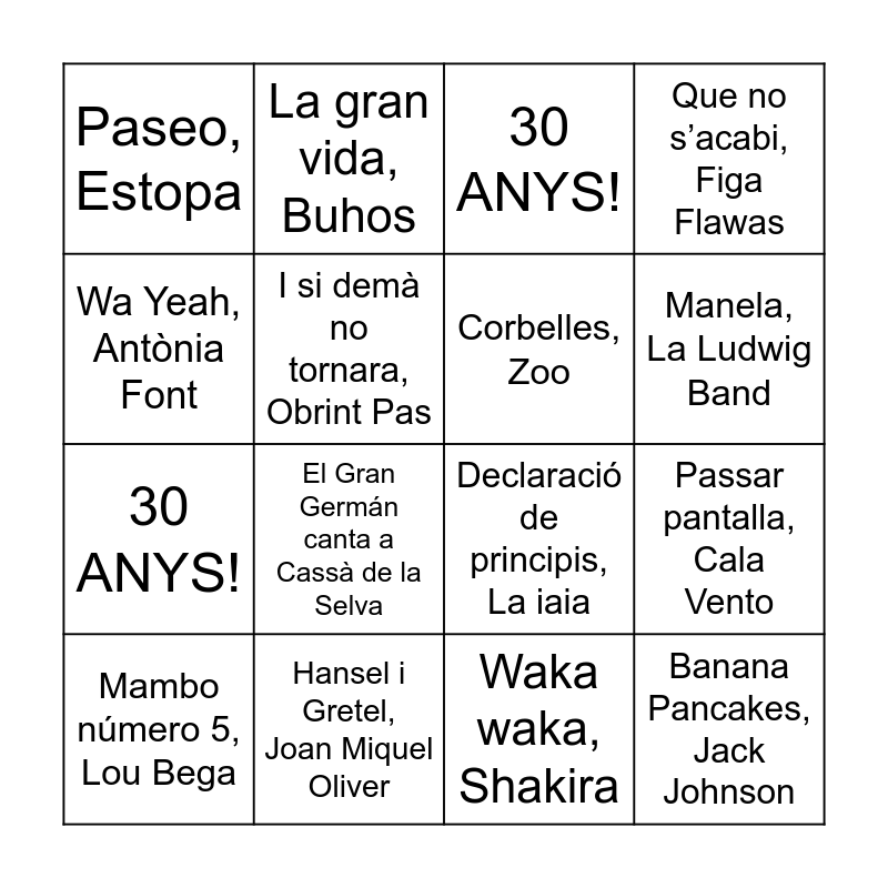 This bingo card has 30 words: 649, Loteria de Catalunya, El coche de Manolo, Strombers, Passar pantalla, Cala Vento, Bailando ska la panza se te va, Strombers, Paseo, Estopa, 30 ANYS!, Corbelles, Zoo, La matinada, Arc de Triomf, Hansel i Gretel, Joan Miquel Oliver, Son mis amigos, Carolina Durante, Waka waka, Shakira, Mambo número 5, Lou Bega, Filomena, Germà Negre, I’m gonna be, The Proclaimers, El Gran Germán canta a Cassà de la Selva, 30 ANYS!, La cançó del romaní, La Ludwig Band, Banana Pancakes, Jack Johnson, Pedres, Mazoni, Wa Yeah, Antònia Font, Declaració de principis, La iaia, Metres per segon, Da Souza, La gran vida, Buhos, 30 ANYS!, I si demà no tornara, Obrint Pas, Que no s’acabi, Figa Flawas, Jean-Luc, Els Amics de les Arts, Cel Clar, Ferran Palau, Manela, La Ludwig Band and 30 ANYS!.