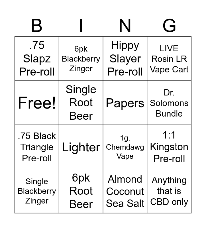 This bingo card has 16 words: 6pk Root Beer, 1:1 Kingston Pre-roll, Hippy Slayer Pre-roll, .75 Slapz Pre-roll, .75 Black Triangle Pre-roll, 6pk Blackberry Zinger, 1g. Chemdawg Vape, Almond Coconut Sea Salt, Free!, Single Root Beer, Single Blackberry Zinger, LIVE Rosin LR Vape Cart, Lighter, Dr. Solomons Bundle, Papers and Anything that is CBD only.