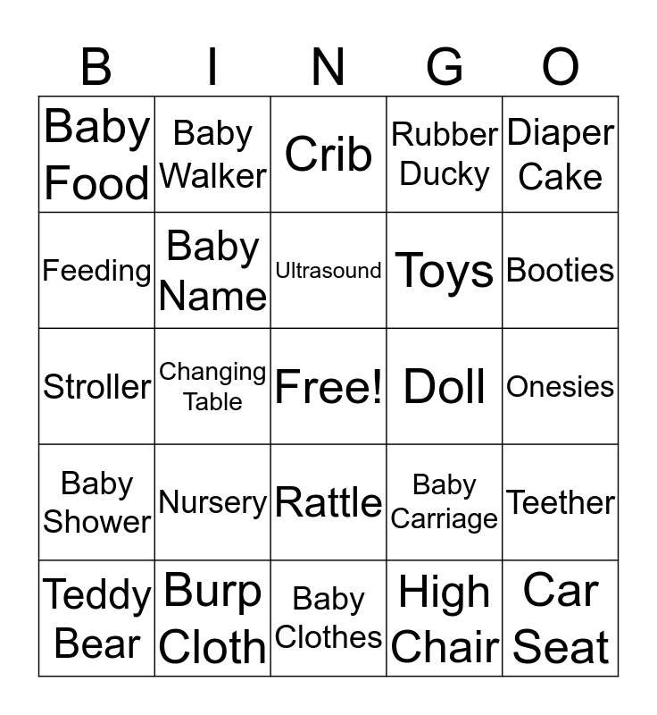 This bingo card has a free space and 24 words: Nursery, Burp Cloth, Ultrasound, Teddy Bear, Diaper Cake, Baby Food, Feeding, Baby Walker, Doll, Rattle, Toys, Stroller, Baby Carriage, Teether, Baby Name, High Chair, Onesies, Crib, Booties, Changing Table, Car Seat, Baby Shower, Rubber Ducky and Baby Clothes.
