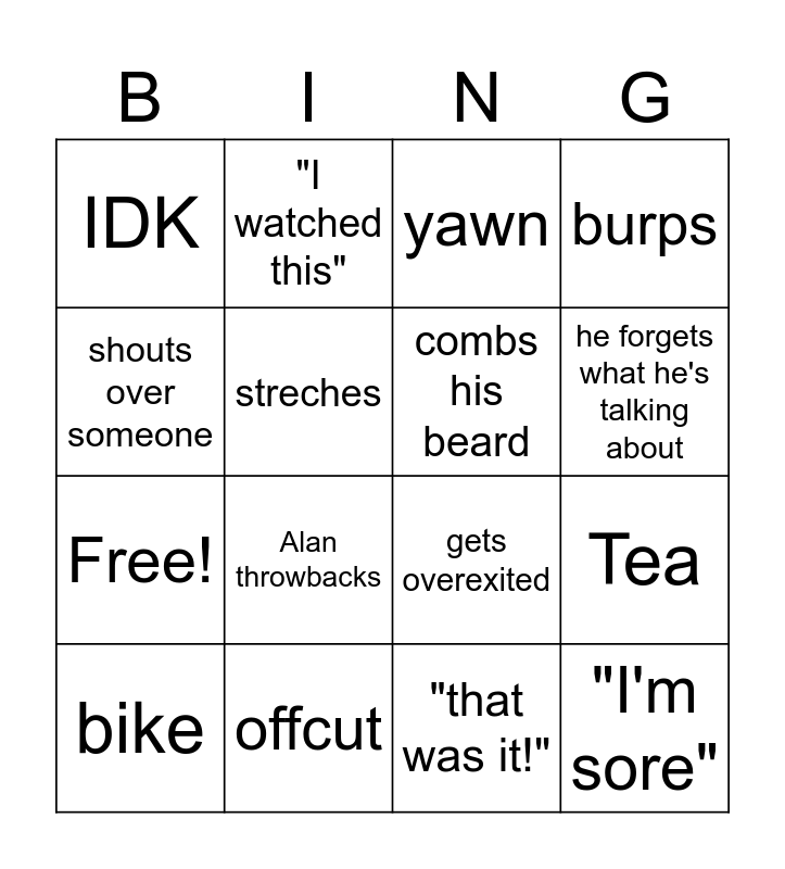This bingo card has 20 words: Tea, Microwave, yawn, praises himself, bike, shouts over someone, offcut, IDK, Free!, "I watched this", Alan throwbacks, gets overexited, streches, "I'm sore", combs his beard, Tells some dumb story, he forgets what he's talking about, burps, "that was it!" and garden.