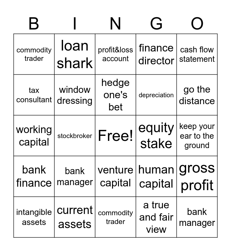 This bingo card has a free space and 24 words: bank manager, current assets, hedge one's bet, intangible assets, cash flow statement, commodity trader, tax consultant, loan shark, equity stake, venture capital, depreciation, working capital, human capital, gross profit, window dressing, a true and fair view, keep your ear to the ground, profit&loss account, go the distance, stockbroker, bank manager, bank finance, finance director and commodity trader.