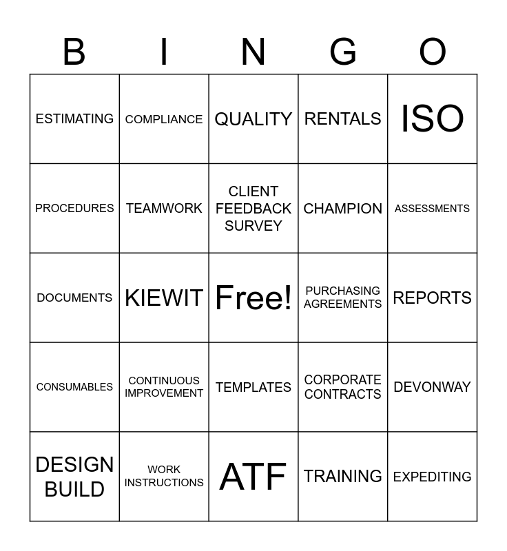 This bingo card has a free space and 24 words: CONTINUOUS IMPROVEMENT, WORK INSTRUCTIONS, CLIENT FEEDBACK SURVEY, DESIGN BUILD, ISO, ESTIMATING, PROCEDURES, COMPLIANCE, PURCHASING AGREEMENTS, TEMPLATES, CHAMPION, DOCUMENTS, CORPORATE CONTRACTS, DEVONWAY, TEAMWORK, TRAINING, REPORTS, QUALITY, ASSESSMENTS, KIEWIT, EXPEDITING, CONSUMABLES, RENTALS and ATF.