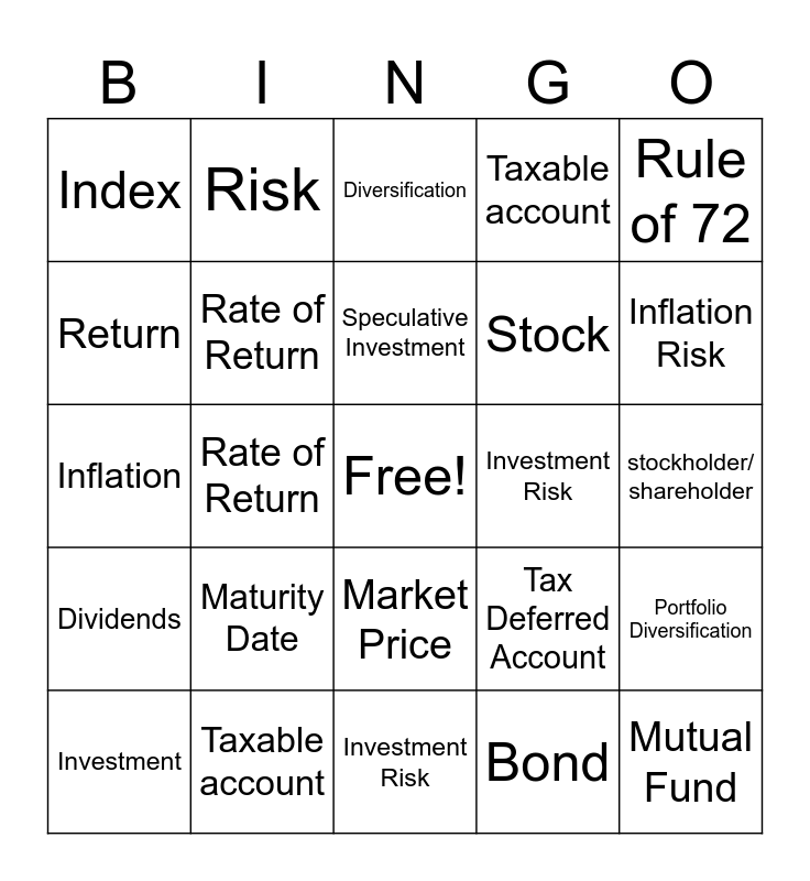 This bingo card has a free space and 24 words: Maturity Date, Taxable account, Speculative Investment, Investment, Rule of 72, Index, Return, Risk, Investment Risk, Market Price, Stock, Inflation, Tax Deferred Account, Portfolio Diversification, Rate of Return, Bond, stockholder/ shareholder, Diversification, Inflation Risk, Rate of Return, Mutual Fund, Dividends, Taxable account and Investment Risk.
