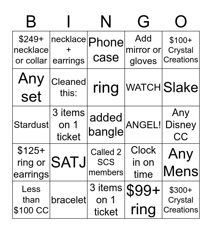 This bingo card has 25 words: SATJ, 3 items on 1 ticket, ring, Less than $100 CC, $100+ Crystal Creations, $249+ necklace or collar, Any set, necklace + earrings, ANGEL!, Called 2 SCS members, WATCH, Stardust, Clock in on time, Any Mens, Cleaned this:, $300+ Crystal Creations, Any Disney CC, Phone case, Slake, 3 items on 1 ticket, added bangle, bracelet, $125+ ring or earrings, Add mirror or gloves and $99+ ring.