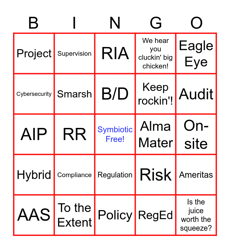 This bingo card has a free space and 32 words: RegEd, PTA/ECM, RR, IAR, Hybrid, Smarsh, Eagle Eye, Ameritas, Supervision, Ops, B/D, RIA, FINRA, SEC, Alma Mater, AIC, AAS, AIP, Regulation, Compliance, Risk, Enforcement, On-site, To the Extent, Is the juice worth the squeeze?, We hear you cluckin' big chicken!, Keep rockin'!, Cybersecurity, Project, Policy, Exam and Audit.