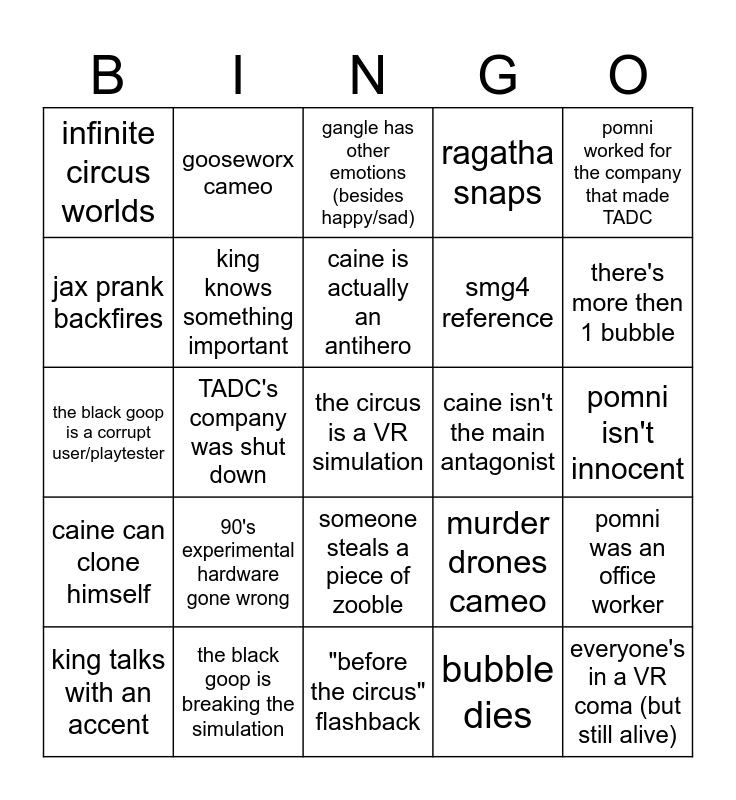This bingo card has a free space and 24 words: 90's experimental hardware gone wrong, the black goop is breaking the simulation, caine is actually an antihero, king talks with an accent, pomni worked for the company that made TADC, infinite circus worlds, jax prank backfires, gooseworx cameo, caine isn't the main antagonist, someone steals a piece of zooble, smg4 reference, the black goop is a corrupt user/playtester, murder drones cameo, pomni was an office worker, king knows something important, bubble dies, pomni isn't innocent, gangle has other emotions (besides happy/sad), there's more then 1 bubble, TADC's company was shut down, everyone's in a VR coma (but still alive), caine can clone himself, ragatha snaps and "before the circus" flashback.