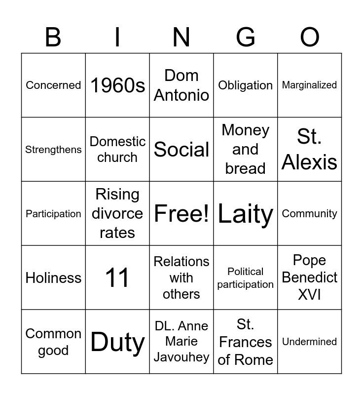This bingo card has a free space and 24 words: 11, Duty, Social, Common good, Marginalized, Concerned, Strengthens, 1960s, Laity, Relations with others, Money and bread, Participation, Political participation, Pope Benedict XVI, Domestic church, St. Frances of Rome, Community, Dom Antonio, St. Alexis, Rising divorce rates, Undermined, Holiness, Obligation and DL. Anne Marie Javouhey.