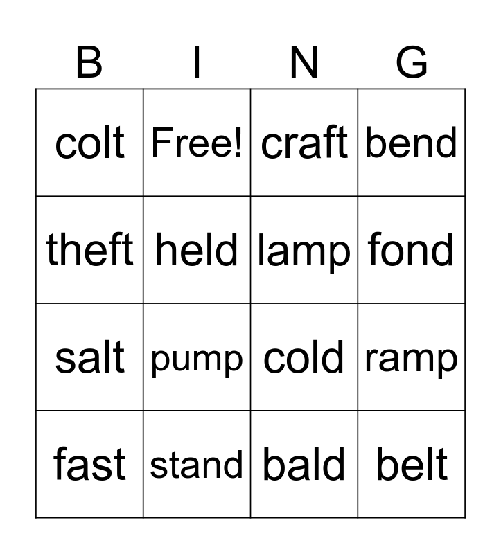 This bingo card has 19 words: cold, left, craft, belt, ramp, theft, bald, colt, Free!, salt, pump, held, lamp, stand, fast, post, bend, fond and list.