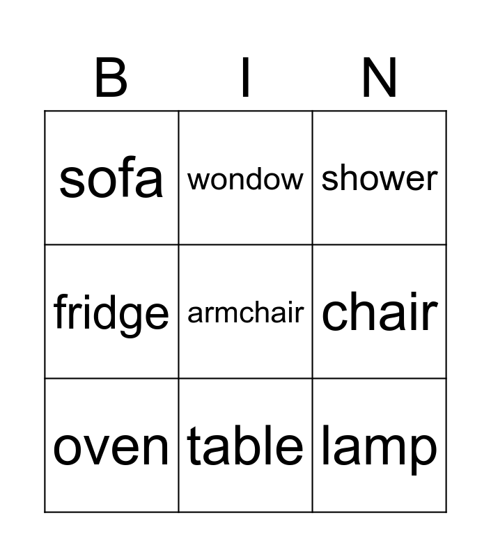 This bingo card has 13 words: Free!, oven, table, chair, sofa, armchair, lamp, bed, toilet, shower, fridge, wondow and door.