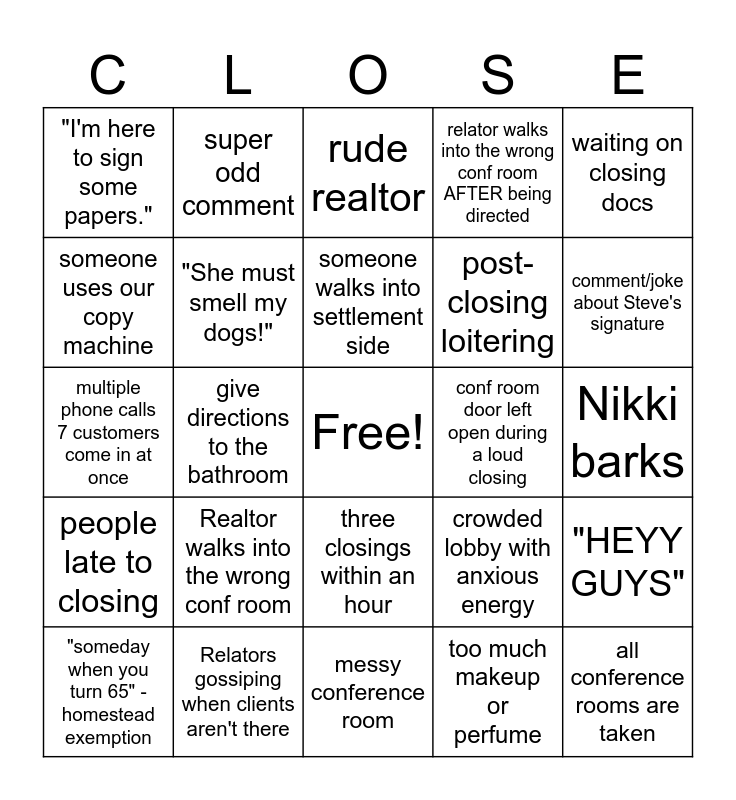 This bingo card has a free space and 24 words: Realtor walks into the wrong conf room, Relators gossiping when clients aren't there, someone walks into settlement side, "someday when you turn 65" - homestead exemption, waiting on closing docs, "I'm here to sign some papers.", someone uses our copy machine, super odd comment, conf room door left open during a loud closing, three closings within an hour, post-closing loitering, multiple phone calls 7 customers come in at once, crowded lobby with anxious energy, "HEYY GUYS", "She must smell my dogs!", too much makeup or perfume, Nikki barks, rude realtor, comment/joke about Steve's signature, give directions to the bathroom, all conference rooms are taken, people late to closing, relator walks into the wrong conf room AFTER being directed and messy conference room.