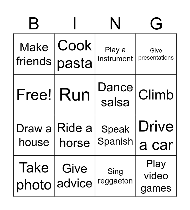 This bingo card has 16 words: Give advice, Drive a car, Play a instrument, Make friends, Draw a house, Cook pasta, Speak Spanish, Sing reggaeton, Free!, Run, Take photo, Give presentations, Ride a horse, Climb, Dance salsa and Play video games.