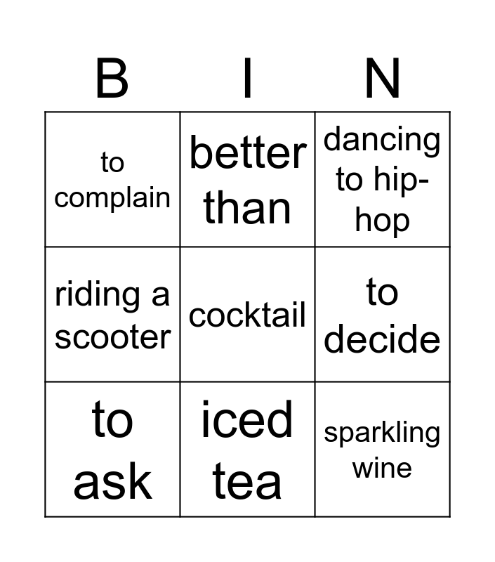 This bingo card has 9 words: to ask, dancing to hip-hop, better than, riding a scooter, to complain, to decide, cocktail, sparkling wine and iced tea.