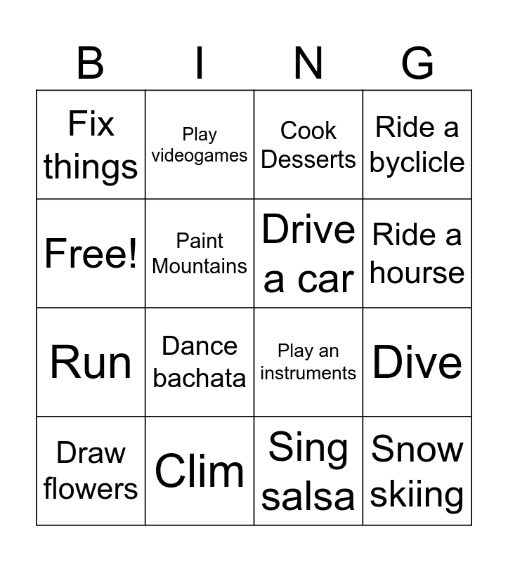 This bingo card has 16 words: Clim, Dive, Cook Desserts, Fix things, Run, Play videogames, Play an instruments, Sing salsa, Free!, Paint Mountains, Draw flowers, Ride a byclicle, Dance bachata, Ride a hourse, Drive a car and Snow skiing.