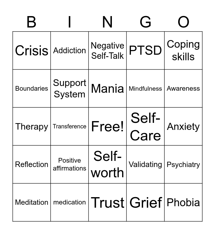 This bingo card has a free space and 39 words: Stress, Delusions, Depression, Support System, Meditation, Self-worth, Mania, Emotions, Coping skills, Reflection, Transference, PTSD, Phobia, Anxiety, Self-Care, Positive affirmations, Insight, Crisis, Active listening, Validating, Boundaries, Trust, Mindfulness, Awareness, Counselor, Recovery, Trigger, CBT, Comorbidity, Addiction, Motivation, Empathy, Negative Self-Talk, medication, Grief, Personality, Psychiatry, Therapy and Psychopathology.