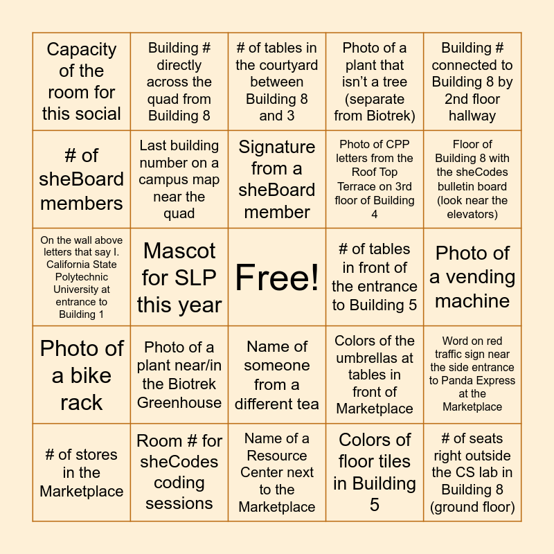 This bingo card has a free space and 24 words: Photo of a plant near/in the Biotrek Greenhouse, Room # for sheCodes coding sessions, Signature from a sheBoard member, # of stores in the Marketplace, Building # connected to Building 8 by 2nd floor hallway, Capacity of the room for this social, # of sheBoard members, Building # directly across the quad from Building 8, # of tables in front of the entrance to Building 5, Name of someone from a different tea, Photo of CPP letters from the Roof Top Terrace on 3rd floor of Building 4, On the wall above letters that say I. California State Polytechnic University at entrance to Building 1, Colors of the umbrellas at tables in front of Marketplace, Word on red traffic sign near the side entrance to Panda Express at the Marketplace, Last building number on a campus map near the quad, Colors of floor tiles in Building 5, Photo of a vending machine, # of tables in the courtyard between Building 8 and 3, Floor of Building 8 with the sheCodes bulletin board (look near the elevators), Mascot for SLP this year, # of seats right outside the CS lab in Building 8 (ground floor), Photo of a bike rack, Photo of a plant that isn’t a tree (separate from Biotrek) and Name of a Resource Center next to the Marketplace.