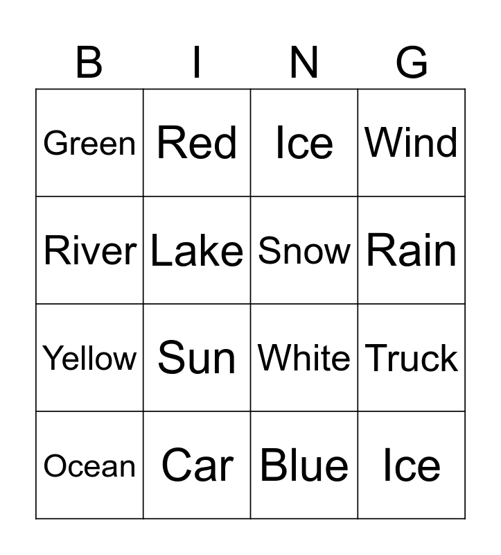 This bingo card has 16 words: Car, Truck, Ice, Green, Yellow, Red, White, Blue, River, Lake, Ocean, Wind, Sun, Rain, Snow and Ice.