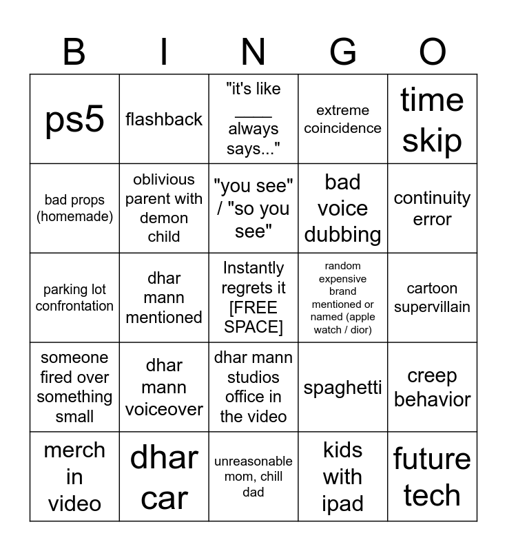 This bingo card has a free space and 24 words: dhar mann voiceover, dhar car, "you see" / "so you see", merch in video, time skip, ps5, bad props (homemade), flashback, random expensive brand mentioned or named (apple watch / dior), dhar mann studios office in the video, bad voice dubbing, parking lot confrontation, spaghetti, creep behavior, oblivious parent with demon child, kids with ipad, cartoon supervillain, "it's like ____ always says...", continuity error, dhar mann mentioned, future tech, someone fired over something small, extreme coincidence and unreasonable mom, chill dad.