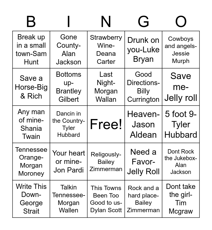 This bingo card has a free space and 30 words: Talkin Tennessee-Morgan Wallen, Amen to that-Dylan Scott, Dancin in the Country-Tyler Hubbard, Five more Minutes-Scotty McCreery, Break up in a small town-Sam Hunt, Strawberry Wine-Deana Carter, Bottoms up-Brantley Gilbert, Religously-Bailey Zimmerman, Heaven-Jason Aldean, This Towns Been Too Good to us-Dylan Scott, 5 foot 9-Tyler Hubbard, Dont take the girl-Tim Mcgraw, Rock and a hard place-Bailey Zimmerman, Shes Country-Jason Aldean, Save me-Jelly roll, You Proof-Margan Wallen, Need a Favor-Jelly Roll, Tennessee Orange-Morgan Moroney, Your heart or mine-Jon Pardi, Cowboys and angels-Jessie Murph, Any man of mine-Shania Twain, Chattahoochee-Alan Jackson, Gone County-Alan Jackson, Good Directions-Billy Currington, Save a Horse-Big & Rich, Drunk on you-Luke Bryan, Dont Rock the Jukebox-Alan Jackson, Write This Down-George Strait, Last Night-Morgan Wallan and Cant have mine-Dylan Scott.