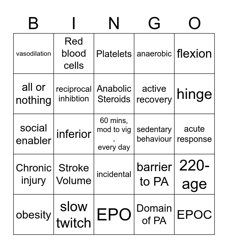This bingo card has a free space and 24 words: Stroke Volume, slow twitch, Anabolic Steroids, obesity, flexion, vasodilation, all or nothing, Red blood cells, sedentary behaviour, incidental, active recovery, social enabler, barrier to PA, 220-age, reciprocal inhibtion, Domain of PA, acute response, Platelets, hinge, inferior, EPOC, Chronic injury, anaerobic and EPO.