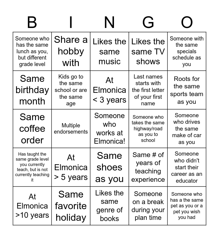 This bingo card has a free space and 24 words: At Elmonica >10 years, At Elmonica > 5 years, At Elmonica < 3 years, Someone on a break during your plan time, Someone with the same specials schedule as you, Someone who has the same lunch as you, but different grade level, Share a hobby with, Likes the same music, Someone who takes the same highway/road as you to school, Someone who drives the same make of car as you, Same coffee order, Kids go to the same school or are the same age, Same # of years of teaching experience, Someone who didn't start their career as an educator, Same birthday month, Same favorite holiday, Likes the same genre of books, Likes the same TV shows, Roots for the same sports team as you, Has taught the same grade level you currently teach, but is not currently teaching it, Multiple endorsements, Same shoes as you, Last names starts with the first letter of your first name and Someone who has a the same pet as you or a pet you wish you had.