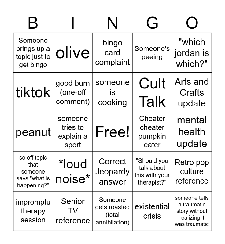 This bingo card has a free space and 37 words: "Who won last time?", "Can you hear it?" / "Is it Loud Enough", "Are you high??", good burn (one-off comment), Retro pop culture reference, *loud noise*, someone is cooking, collective "throw jake into space" joke, "which jordan is which?", "What did Donnie say?", someone tries to explain a sport, Someone's peeing, someone tells a traumatic story without realizing it was traumatic, mental health update, tiktok, so off topic that someone says "what is happening?", discussion on inequality, bingo card complaint, Correct Jeopardy answer, Cheater cheater pumpkin eater, Someone brings up a topic just to get bingo, Arts and Crafts update, impromptu therapy session, Someone gets roasted (total annihilation), ITYSL reference, existential crisis, olive, sterling, Parental complaints, someone disappears, Kennedy discovers a new thing, Senior TV reference, peanut, Kennedy is bad (good) at video games, "Should you talk about this with your therapist?", Cult Talk and "Google it.".