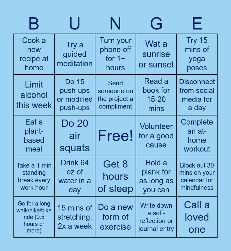 This bingo card has a free space and 24 words: Drink 64 oz of water in a day, 15 mins of stretching, 2x a week, Send someone on the project a compliment, Go for a long walk/hike/bike ride (0.5 hours or more), Try 15 mins of yoga poses, Cook a new recipe at home, Limit alcohol this week, Try a guided meditation, Volunteer for a good cause, Get 8 hours of sleep, Read a book for 15-20 mins, Eat a plant-based meal, Hold a plank for as long as you can, Block out 30 mins on your calendar for mindfulness, Do 15 push-ups or modified push-ups, Write down a self-reflection or journal entry, Complete an at-home workout, Turn your phone off for 1+ hours, Disconnect from social media for a day, Do 20 air squats, Call a loved one, Take a 1 min standing break every work hour, Wat a sunrise or sunset and Do a new form of exercise.