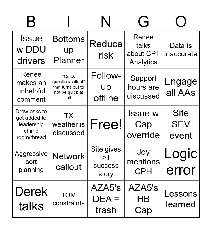 This bingo card has a free space and 24 words: Network callout, TOM constraints, Follow-up offline, Derek talks, Data is inaccurate, Issue w DDU drivers, Renee makes an unhelpful comment, Bottoms up Planner, Issue w Cap override, Site gives >1 success story, Support hours are discussed, Drew asks to get added to leadership chime room/thread, Joy mentions CPH, Logic error, "Quick question/callout" that turns out to not be quick at all, AZA5's HB Cap, Site SEV event, Reduce risk, Engage all AAs, TX weather is discussed, Lessons learned, Aggressive sort planning, Renee talks about CPT Analytics and AZA5's DEA = trash.