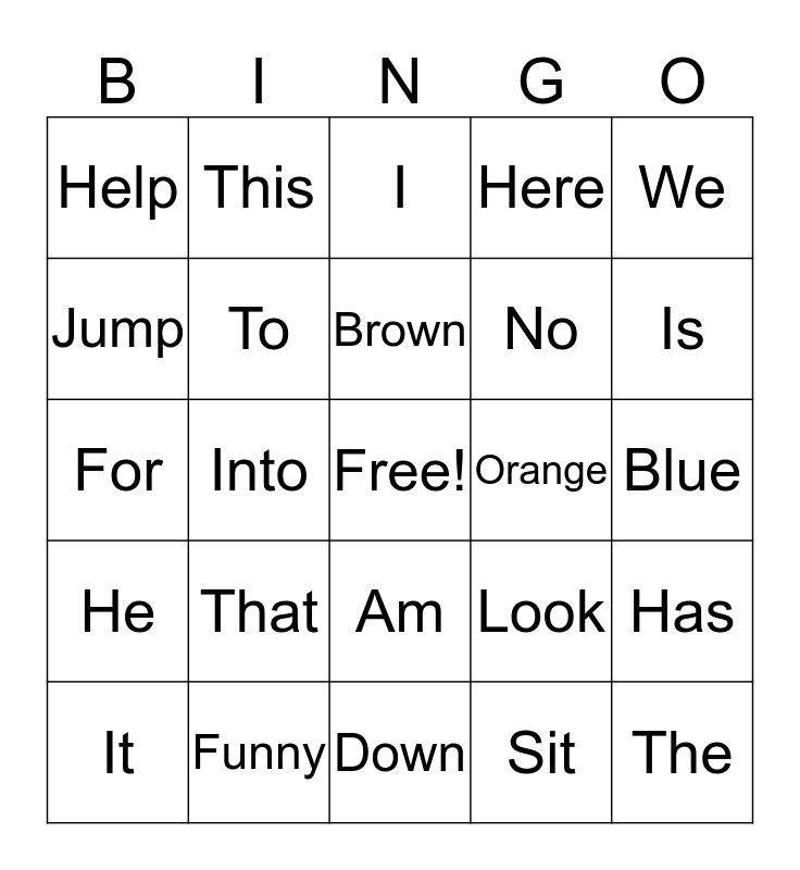 This bingo card has a free space and 90 words: A, All, Am, An, And, Are, At, Ate, Away, Be, Because, Big, Black, Blue, Boy, Brown, But, Came, Can, Come, Did, Do, Down, Eat, For, Funny, Get, Girl, Go, Good, Green, Has, Have, He, Help, Here, I, In, Into, Is, It, Jump, Left, Like, Little, Look, Make, Me, Must, My, New, No, Not, Now, Off, On, Orange, Our, Over, Play, Purple, Red, Right, Run, Said, See, She, Sit, Small, Stop, That, The, There, They, This, To, Too, Under, Up, Want, Was, We, Went, What, Where, Will, With, Yellow, Yes and You.