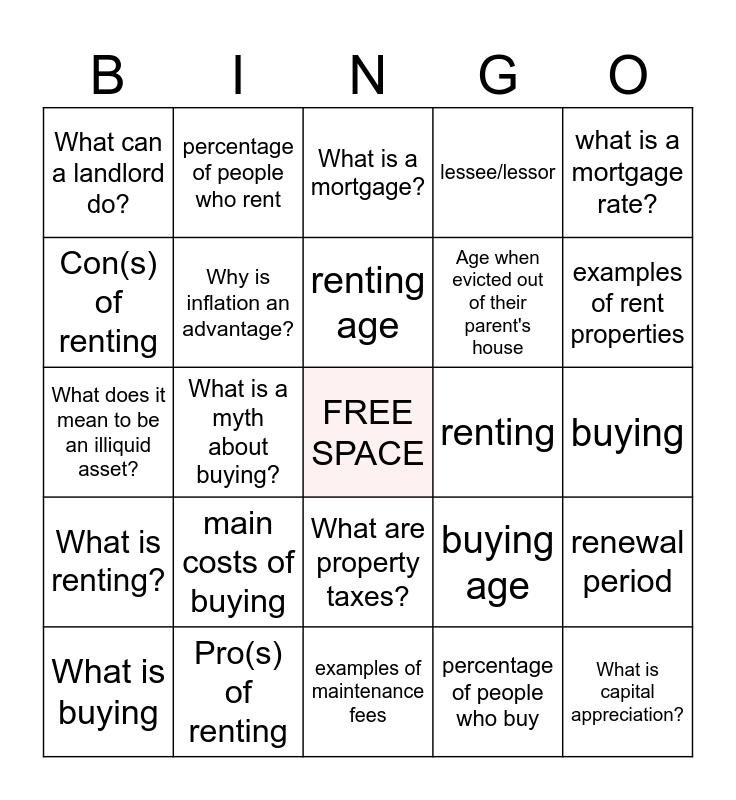 This bingo card has a free space and 24 words: main costs of buying, Pro(s) of renting, renting age, What is buying, what is a mortgage rate?, What can a landlord do?, Con(s) of renting, percentage of people who rent, renting, What are property taxes?, Age when evicted out of their parent's house, What does it mean to be an illiquid asset?, buying age, renewal period, Why is inflation an advantage?, percentage of people who buy, buying, What is a mortgage?, examples of rent properties, What is a myth about buying?, What is capital appreciation?, What is renting?, lessee/lessor and examples of maintenance fees.